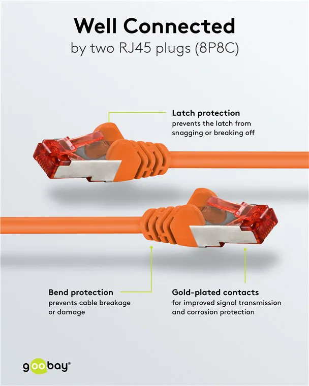 Τα καλώδια δικτύου της Goobay κατασκευάζονται από ποιοτικά υλικά, με τις υψηλότερες τεχνικές προδιαγραφές, προσφέροντας αξιόπιστη λειτουργία υψηλής απόδοσης, με αντοχή στον χρόνο.