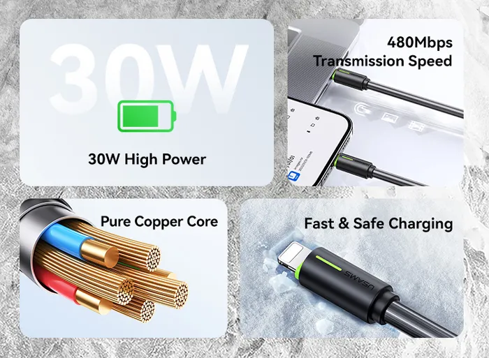 Καλώδιο φόρτισης και μεταφοράς δεδομένων Lightning σε USB-C της Usams. Υποστηρίζει φόρτιση με απόδοση έως 30W και μεταφορά δεδομένων με ταχύτητα έως 480Mbps.